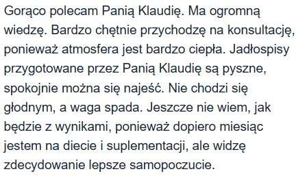 Zależy mi na tym, by pacjenci mogli wprowadzić trwałe zmiany w swoim sposobie odżywiania i nawykach. Rygorystyczne, wymagające diety może i przynoszą szybkie rezultaty, ale mało kto jest w stanie wytrwać w nich dłużej niż kilka tygodni. Wcale nie musisz się tak męczyć, by osiągnąć swój cel.